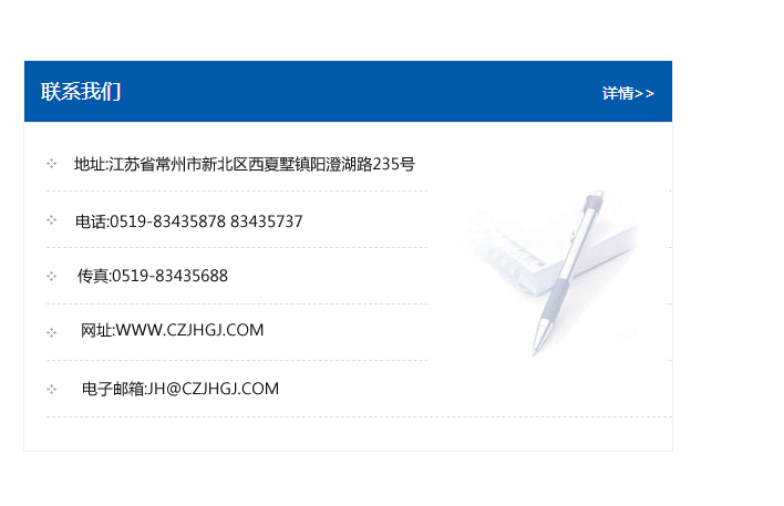 傳真:0519-83435688    郵編:213135    網(wǎng)址:WWW.czjhgj_com.wqjgroup.com    電子郵箱:JH@czjhgj_com.wqjgroup.com